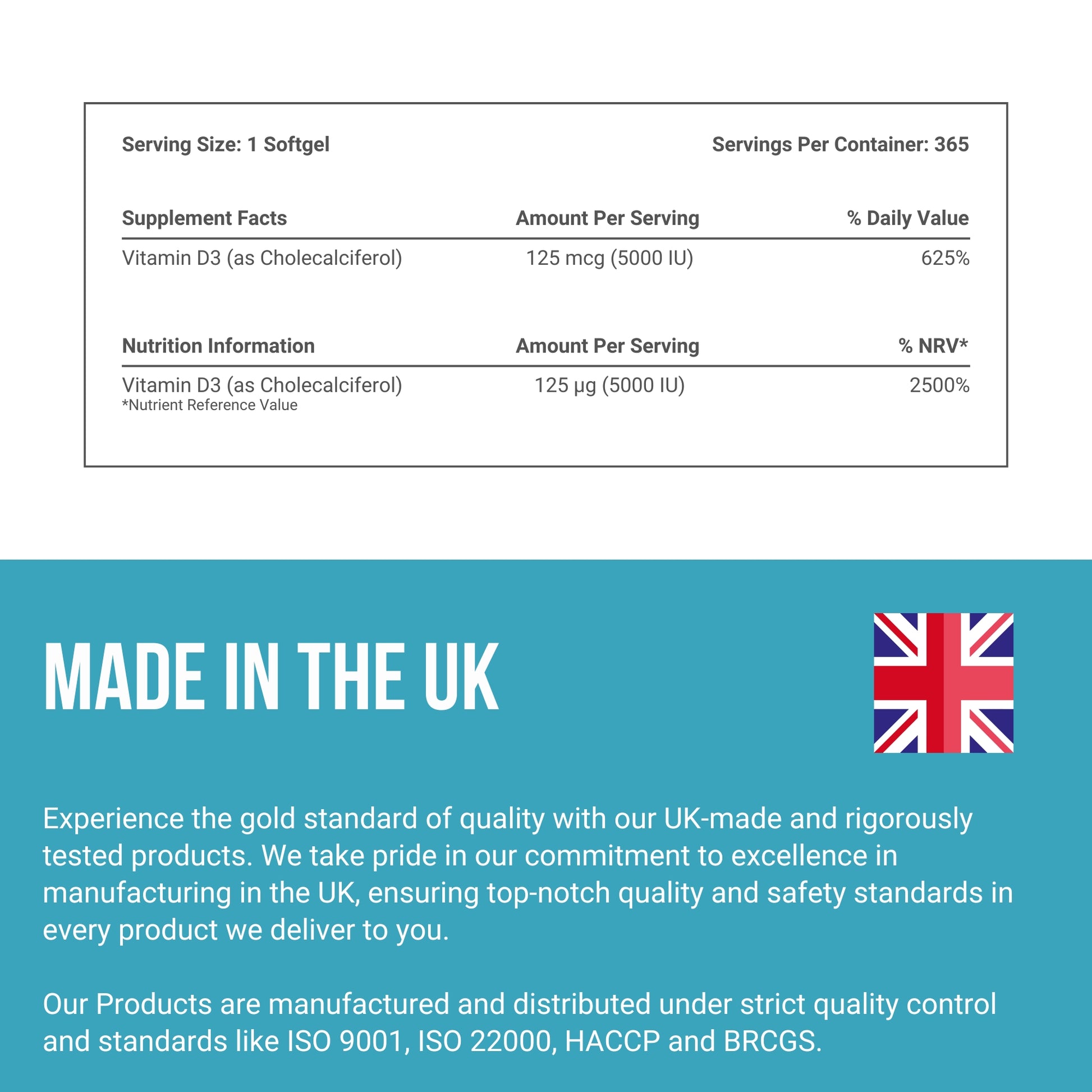 Vitamin D3 5000 IU (125 µg) – Preservative-Free Softgels, 1-Year Supply