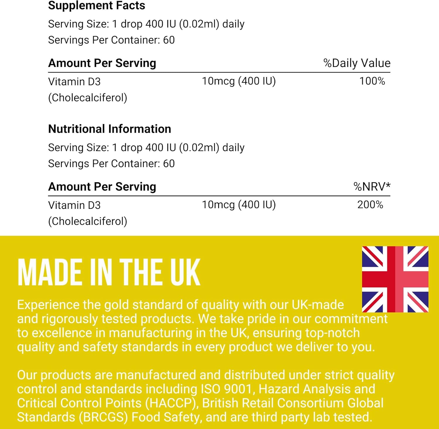 Meets All Department of Health Recommendations Peace of mind that your baby is receiving the correct level of Vitamin D3. We use Vitamin D3 (cholecalciferol), shown by research to be more effectively absorbed than D2, which is often used in other infant supplements. NHS Recommended for Breastfed Babies Provides 400 IU (10 µg) of Vitamin D3 per drop — in line with UK Department of Health and NHS guidance for all breastfed babies from birth to 12 months, and for formula-fed babies consuming less than 500 ml of formula daily. USDA Organic & Non-GMO Certified Certified USDA Organic and Non-GMO, offering a safe, trustworthy, plant-based supplement to support your baby’s normal bone growth, immune function, and healthy development. Made in the UK to BRCGS Standards Proudly made in the UK in facilities certified to BRCGS, ISO 9001, HACCP, USDA Organic, and Halal/Kosher standards. Every batch is third-party tested to guarantee purity, potency, and consistency. Travel-Friendly & Long-Lasting No refrigeration needed. Each bottle contains 60 drops (2-month supply), making it a convenient, reliable daily essential—at home or on the go.