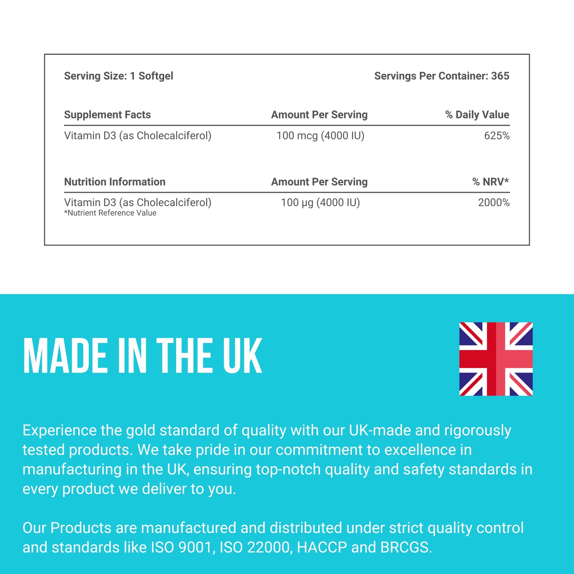 Produced in certified UK facilities meeting BRCGS, ISO 9001, and HACCP standards, then third-party tested to ensure purity, potency, and peace of mind — 365 softgels providing a full year of clean, effective nutrition.